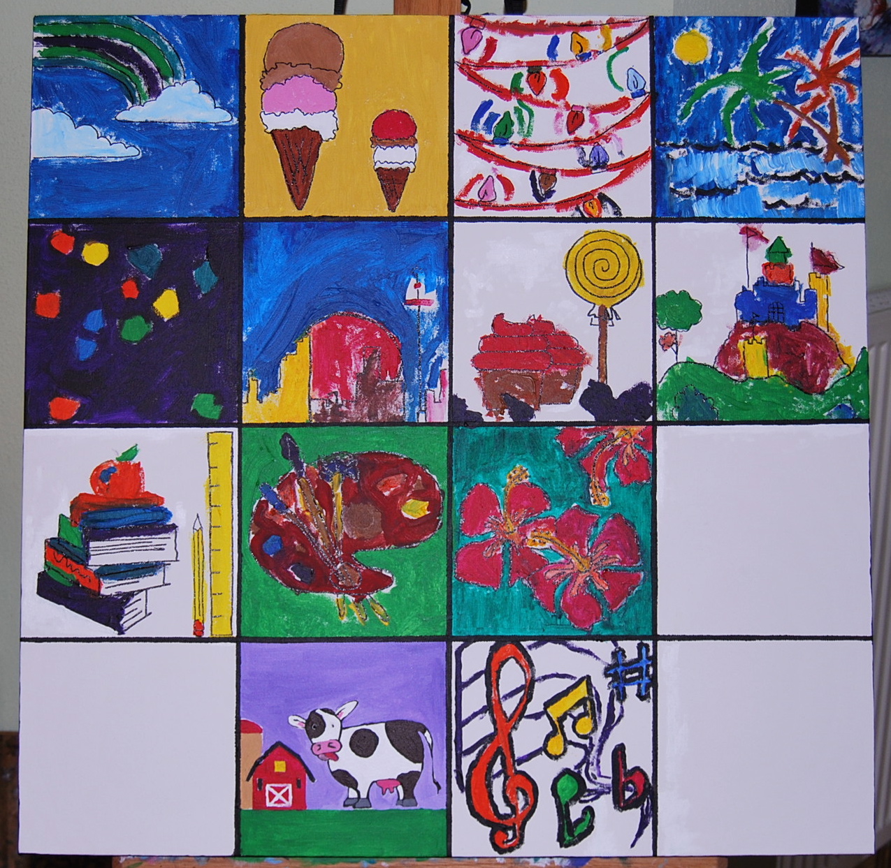 Well, the birthday girl wanted to leave on empty. Her dad is away right now. When he gets back home she would like him to fill one in. The other two will be filled with paint splashing and splattering. In order to successfully accomplish this in only two squares we had to wait for the painting to dry so it could be taped off.