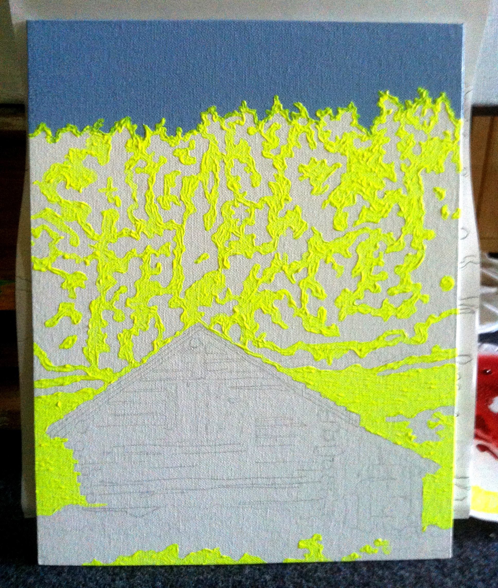 After a long wait the painting comes off the wall and back on the easel. I’m ready to give it a second chance. Or is it ready to give me a second chance? Instead of filling the palette with paint and trying to force the same idea through this pathetic period, I decide to start with a clean slate. I apply a coat of gesso to my canvas, erasing almost all of the torture I had previously put in it. It is revitalized and so am I; ready to smile at the start of a new beginning.