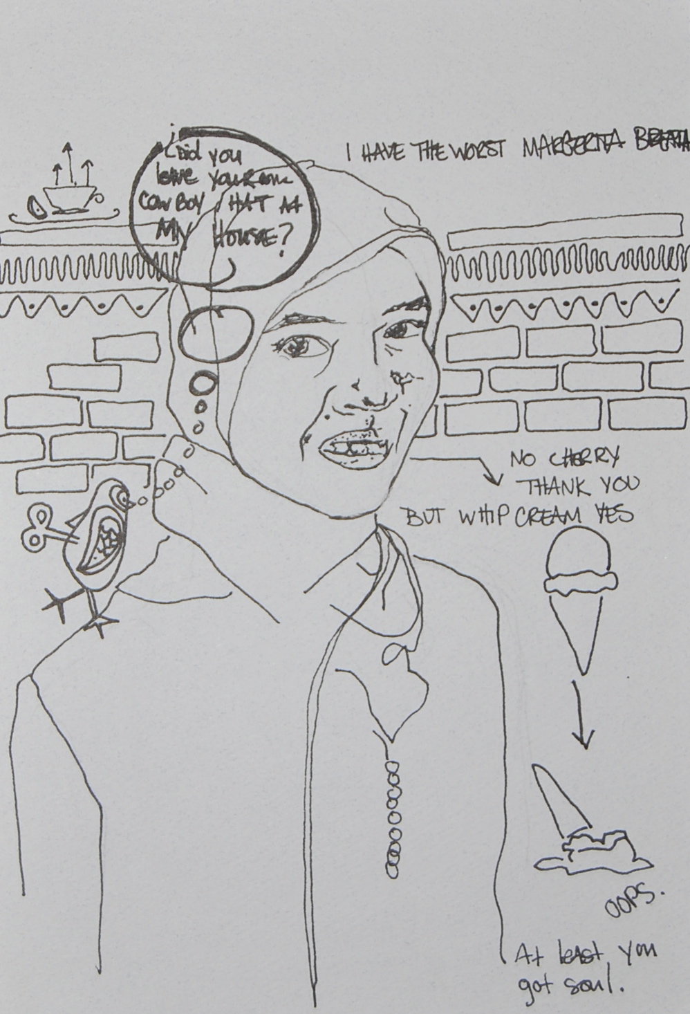 As I have previously stated, I have no idea what I was thinking when I drew this. I hope I actually did have margarita breath. It would make it easier to understand how I could have thought it up. Unfortunately I doubt I was drinking margaritas in Nova Scotia. And the poor girl. she couldn’t be uglier. Her eyes aren’t even aligned, and what’s up with her teeth? As I type on, I may actually be regretting the choice I made to share this sketch.