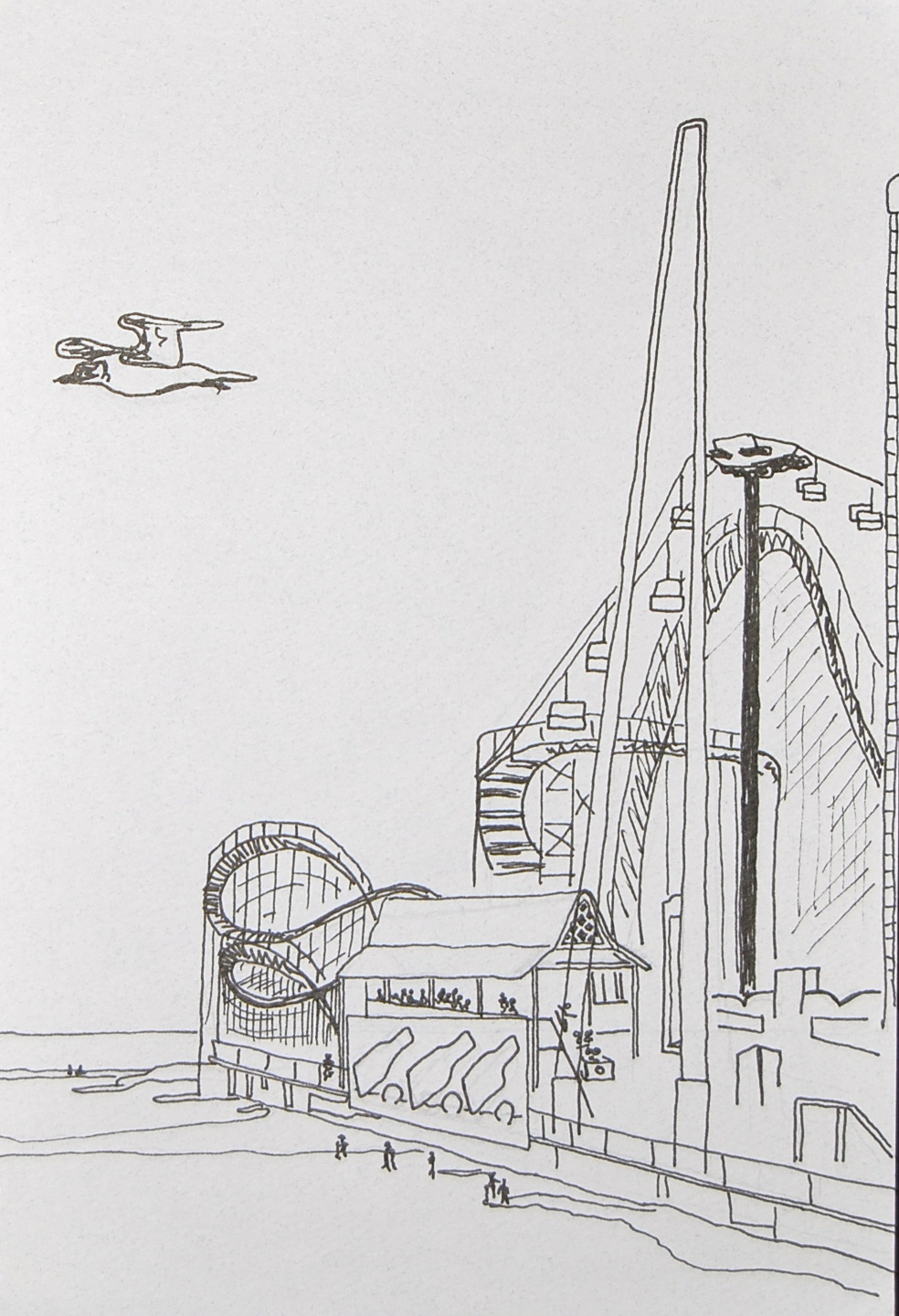 This sketch is a bit older, maybe 2006. Simply put, it’s a drawing of an ocean pier full of rides. But like all memorabilia, it goes deeper than that. The place is Wildwood, New Jersey. It’s a beach town in Jersey located on the southern coast. Ever since the first year I was born (and before) my grandparents would rent a beach house for a week in Sea Isle City, New Jersey. All of my grandmother’s brothers and sisters would get a house the same week. The whole family would be together and it was great fun. We would take one day in the week and make a short trip from Sea Isle to Wildwood. As a kid, I thought Wildwood was the best. It had an enormous beach that you hiked for about a quarter mile (or so it seemed) just to get to the water’s edge. There were ice cream vendors that walked up and down the beach with coolers. Not all the beaches had that. I always bought a Fudgesicle, a.k.a fudgie-wudgie. Wildwood also had an extremely developed boardwalk, double wide, complete with three piers of rides, games, and amusements, tons of shops with florescent bathing suits, Oakley windbreakers, and hermit crabs, the best fudge in New Jersey, the largest slices of pizza known to Man, more seagulls per square foot than anywhere else in the world, and its own train that you could ride from one end of the boardwalk to the other. As the years wore on they took their tole on Wildwood. It got older, more weathered and a bit dirtier, but for me it never lost it’s charm.