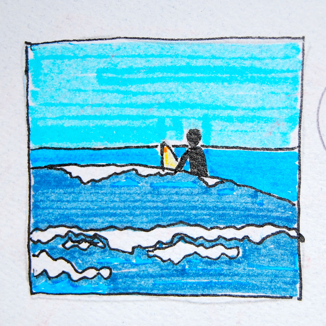 These first two sketches I made on the beach in Manasquan, New Jersey. We lived there for the first time during the spring and summer of 2007. Phil towed banners up and down the beach in an airplane and I worked in a lobster restaurant. On this particular day Phil was surfing. As it wasn’t quite yet summer, the air was chilly and the water was freezing. I chose to stay on dry land. I drew this tiny sketch of him out in the water and the other sketch of the jetty before I got restless and traded doodling for a walk down the coastline.