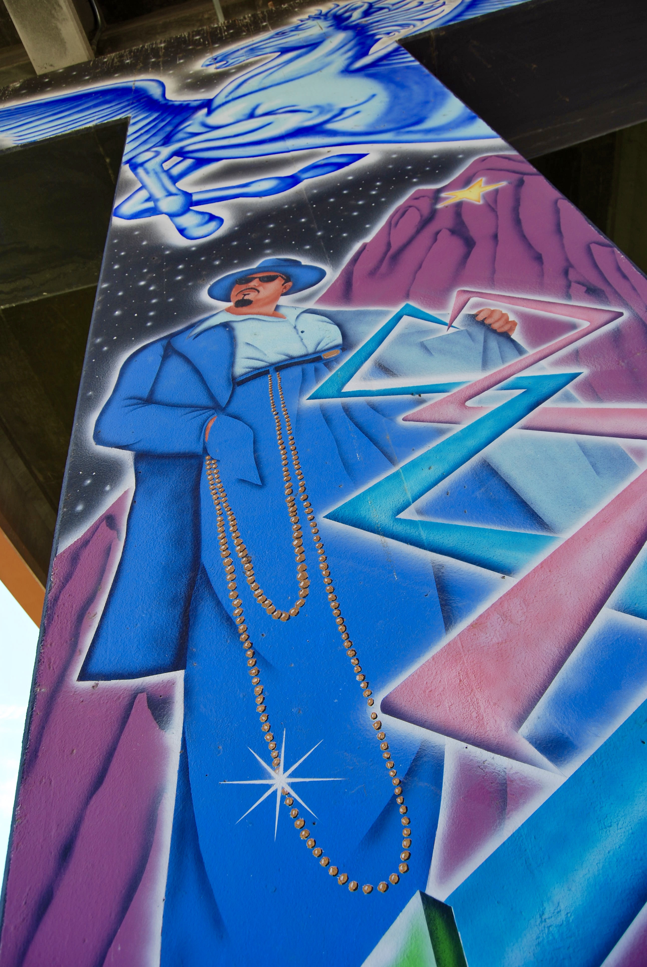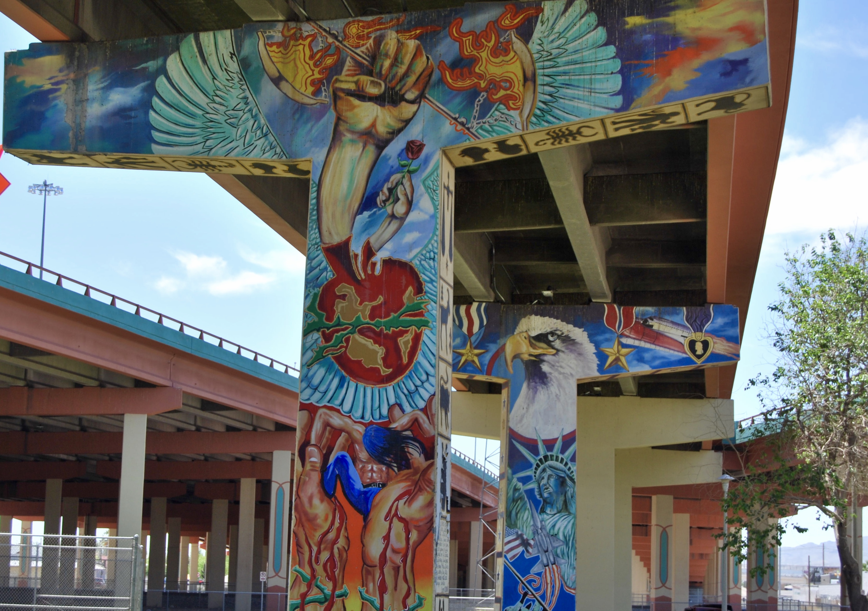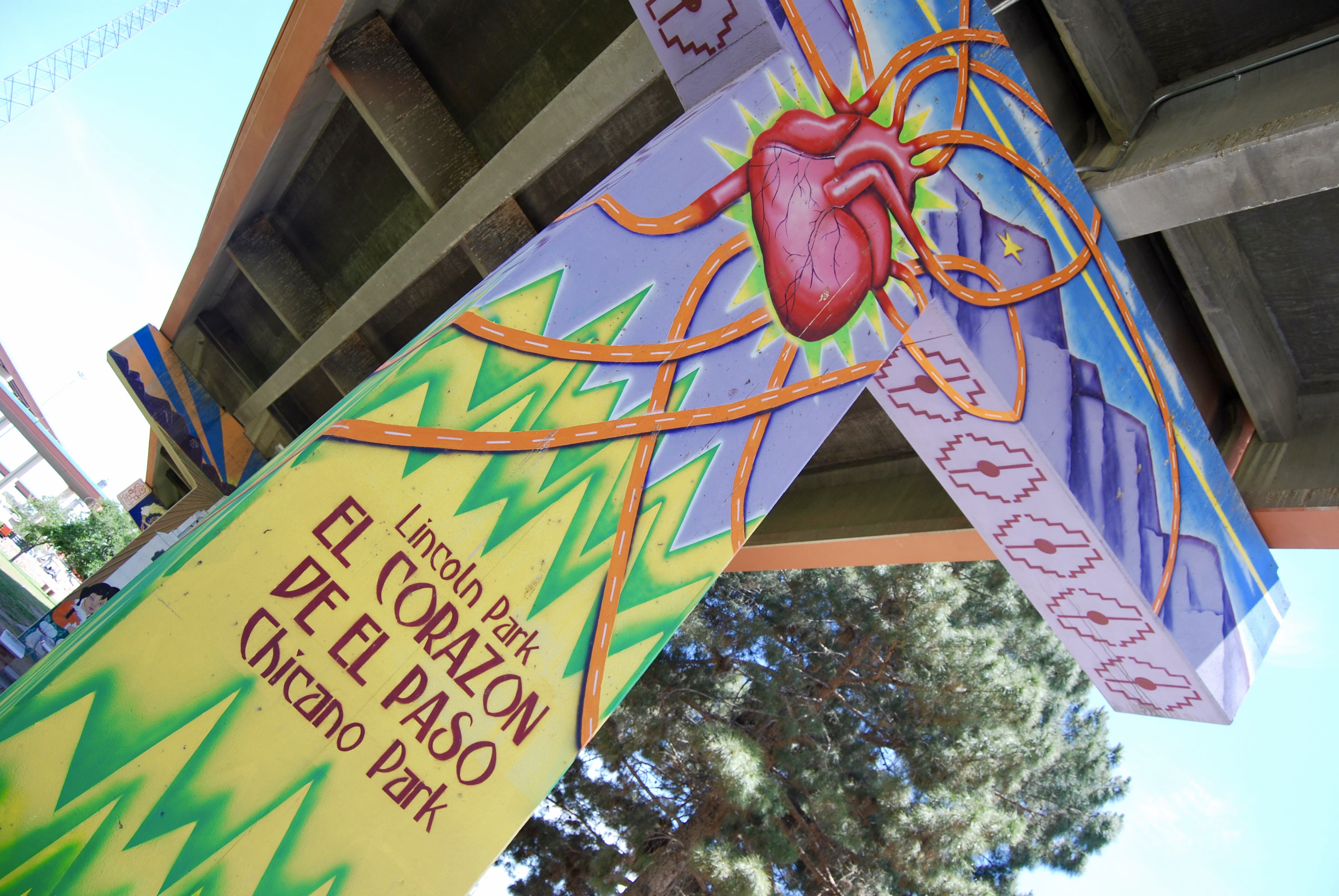 A great example of the love and pride that energized this project is the “El Corazón de El Paso” mural, painted in 2009. It’s a 30’x20’ T-shaped freeway column by Gabriel S. Gaytán. The idea for the mural came from David González a member of the Latin Pride Car Club, who sponsored the mural project and commissioned it. González gave a sketch to Gaytán. Gaytán added images of the Franklin Mountains, the star on the mountain, and Mexican pyramids. The pyramids symboliz El Paso’s strong Mexican-American heritage and population. The main image of the mural was that of a human heart with highways as arteries. This was to honor the physical location.