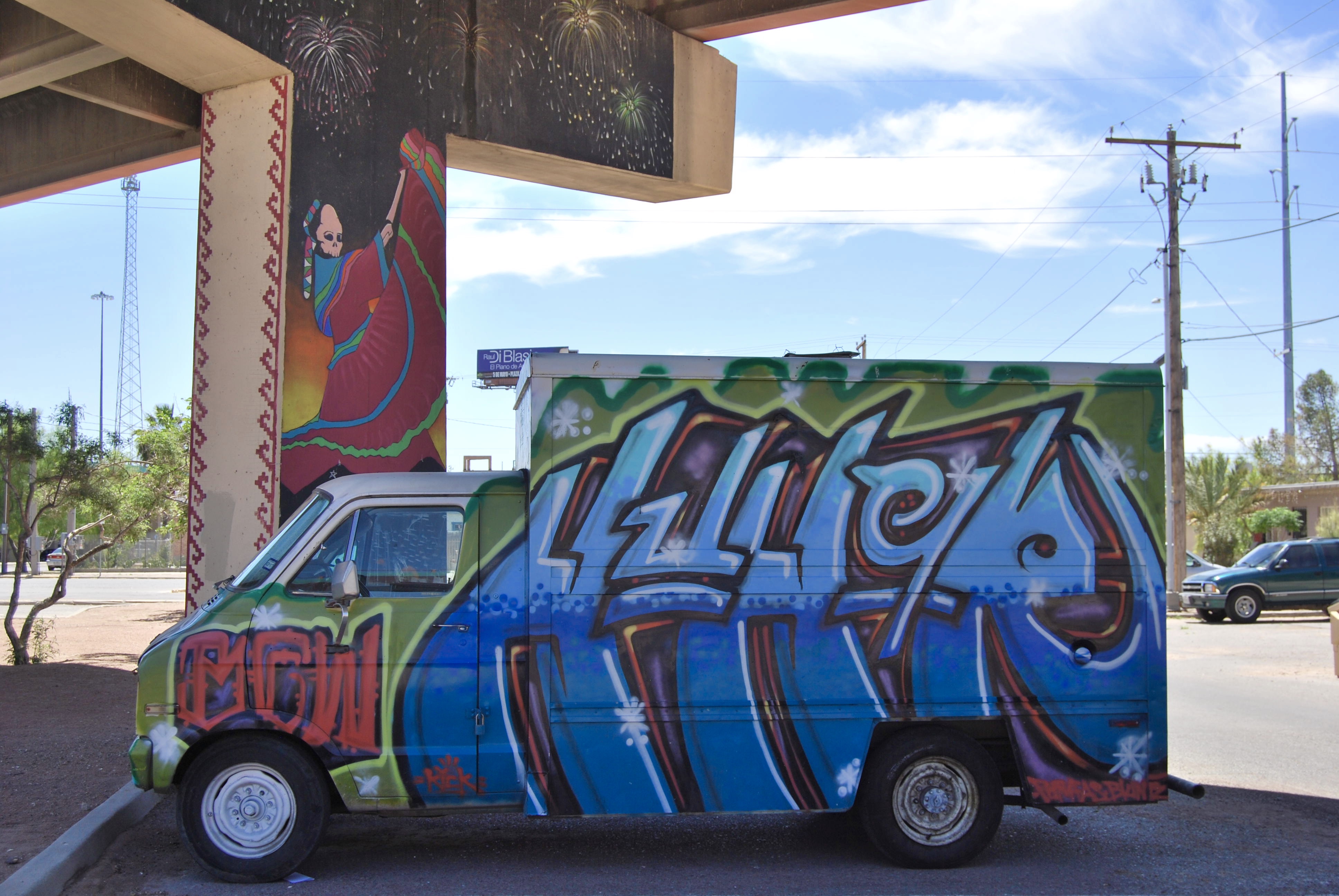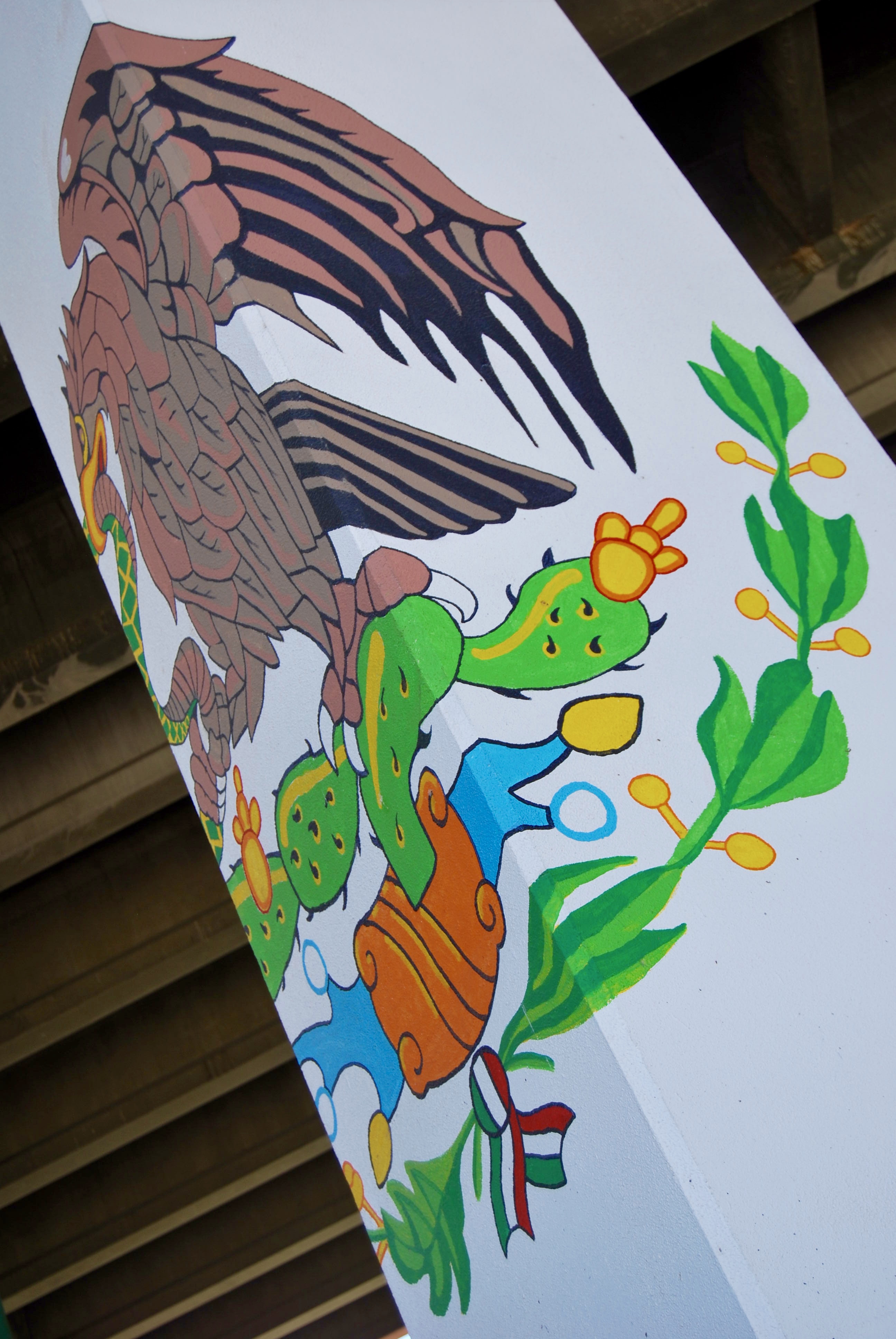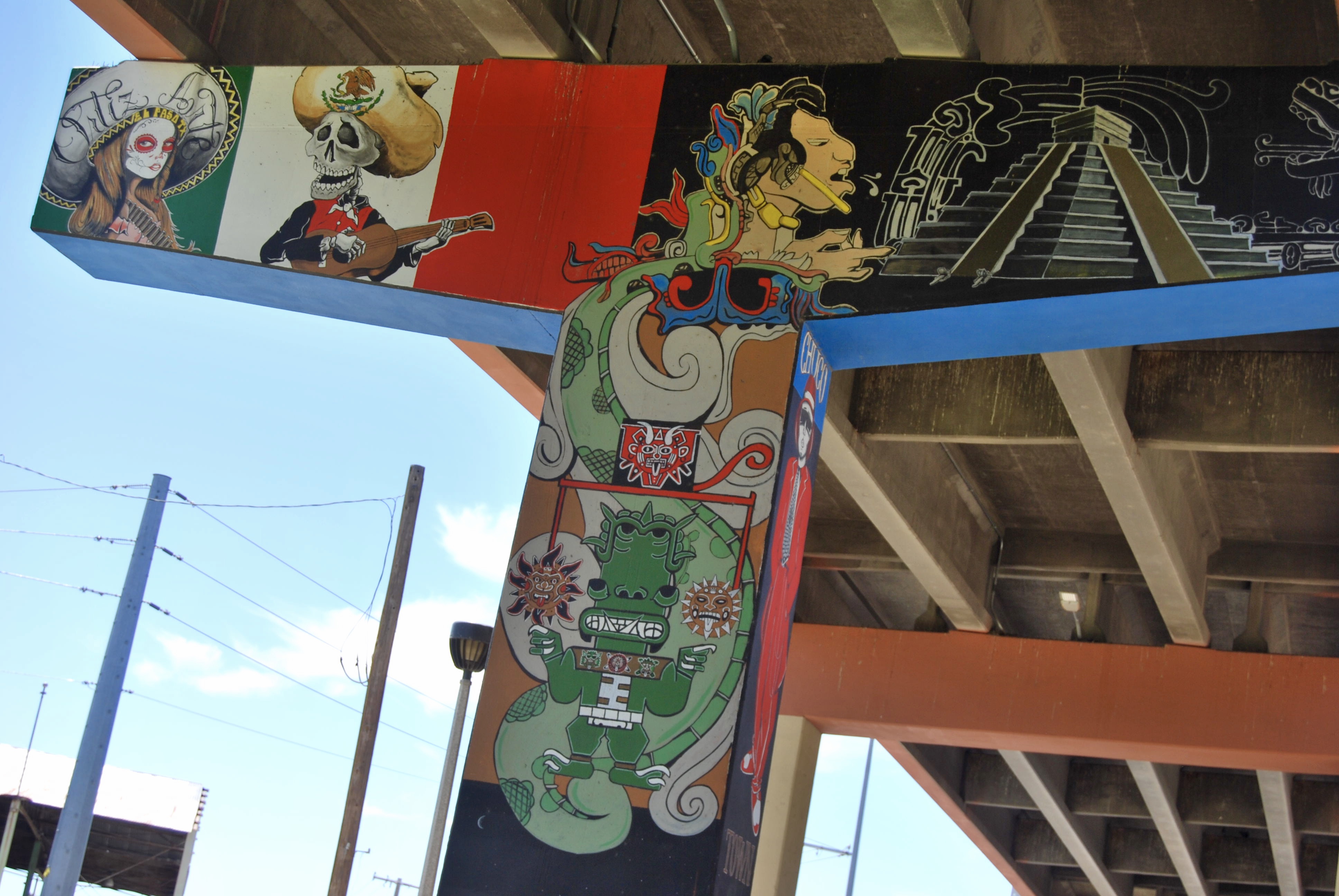 A great example of the love and pride that energized this project is the “El Corazón de El Paso” mural, painted in 2009. It’s a 30’x20’ T-shaped freeway column by Gabriel S. Gaytán. The idea for the mural came from David González a member of the Latin Pride Car Club, who sponsored the mural project and commissioned it. González gave a sketch to Gaytán. Gaytán added images of the Franklin Mountains, the star on the mountain, and Mexican pyramids. The pyramids symboliz El Paso’s strong Mexican-American heritage and population. The main image of the mural was that of a human heart with highways as arteries. This was to honor the physical location.