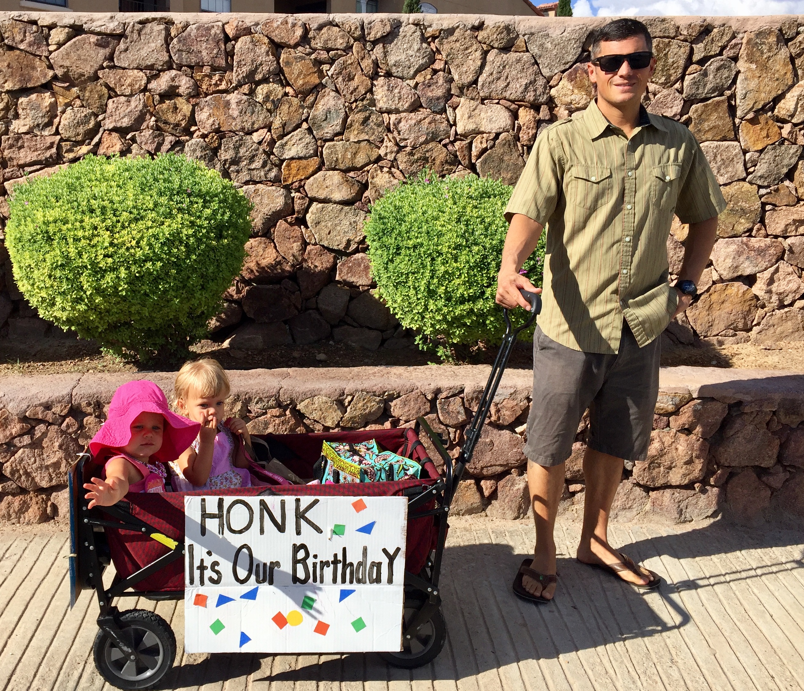 For the birthday dinner Nina and Lila said they wanted to go to a restaurant and have pizza. There is a nice pizza restaurant on the corner near our house, so we decided we would walk there. I decorated our wagon with birthday signs and we told the girls we were going to have a parade to the restaurant. They put on party dresses, necklaces, and bracelets. They also grabbed their purses full of combs, lotion, and mirrors before heading out the door. Both sides of the wagon read, “Honk. It’s Our Birthday.” We told the girls people would be honking for their birthday and they had to wave. Needless to say, to the restaurant and back were two of the best walks of my life. The girls got a kick out of it and so did we… happy birthday ladies, here’s five minutes of fame.
