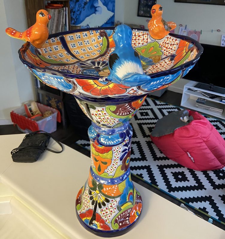 My mom came to visit the weekend before my birthday. We went shopping. My mom is fun to shop with. This talavera birdbath (she got me) really got the celebration started. Talavera is a style of Spanish pottery commonly made in Mexico. I got my item at Old Santa Fe Pottery in Denver but it can easily be found online as well.